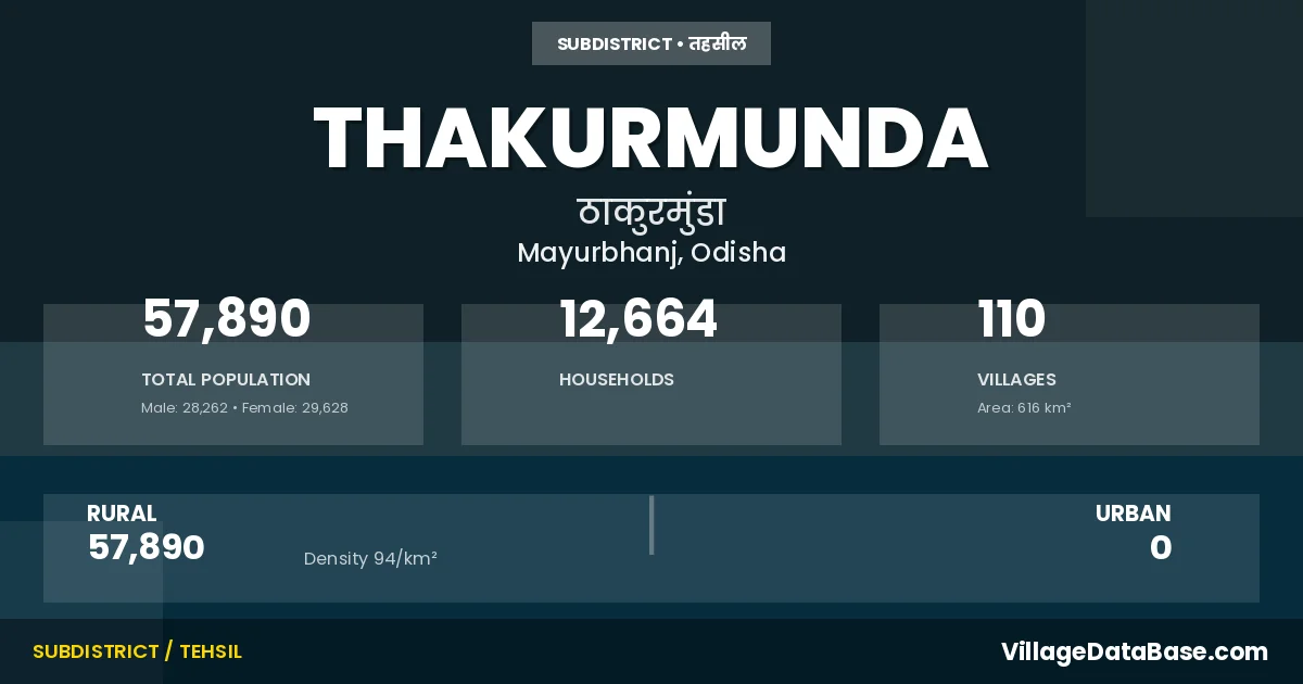 According to the 2011 census The total area of Thakurmunda Tehsil is 616 km², with a population of 57890 people. The population density is 94 inhabitants per square kilometre, and there are approximately 12664 houses in the sub district.
