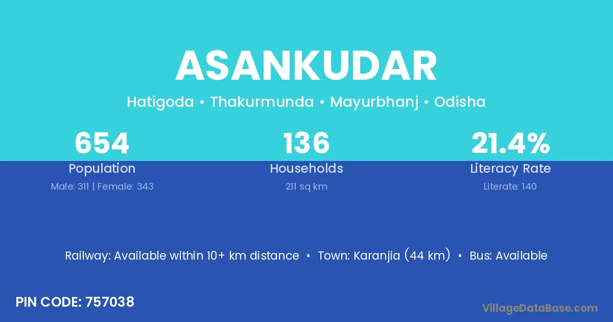 Karanjia (44 km) is the nearest town to Asankudar village for major economic activities and is located approximately 44 km away.