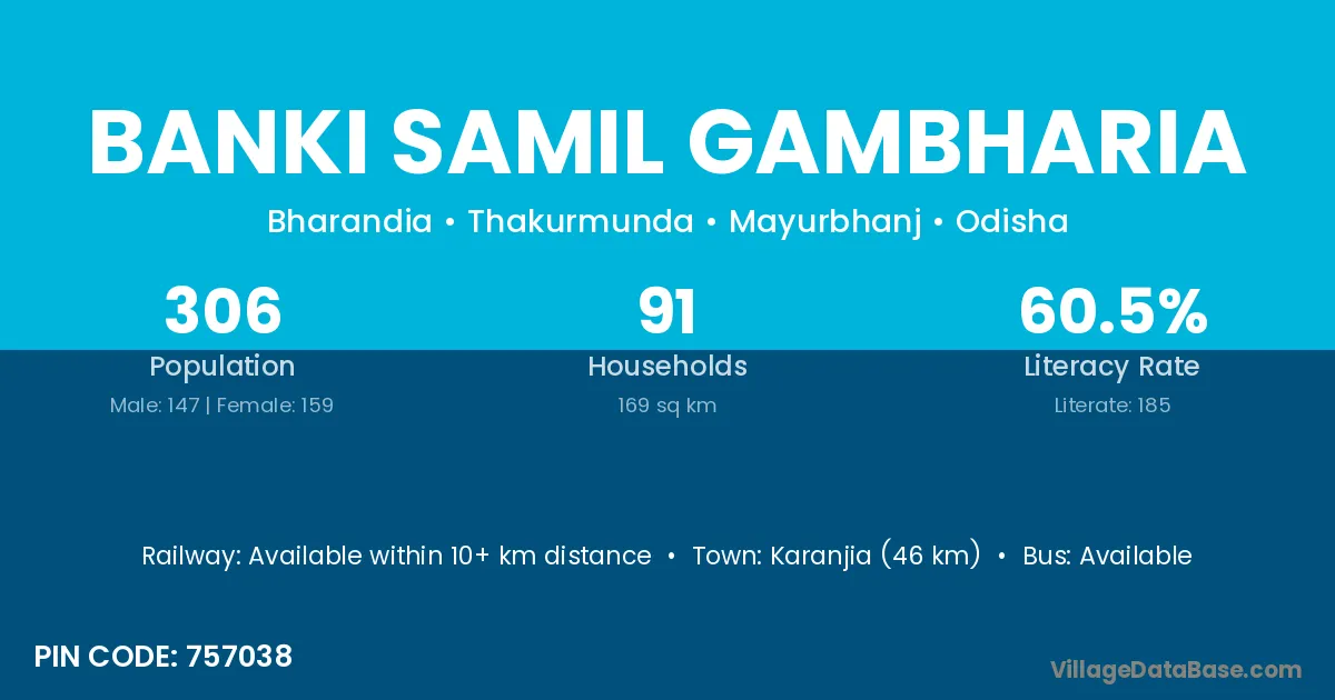 Karanjia (46 km) is the nearest town to Banki Samil Gambharia village for major economic activities and is located approximately 46 km away.