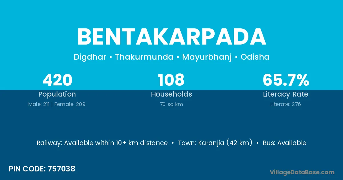 Karanjia (42 km) is the nearest town to Bentakarpada village for major economic activities and is located approximately 42 km away.