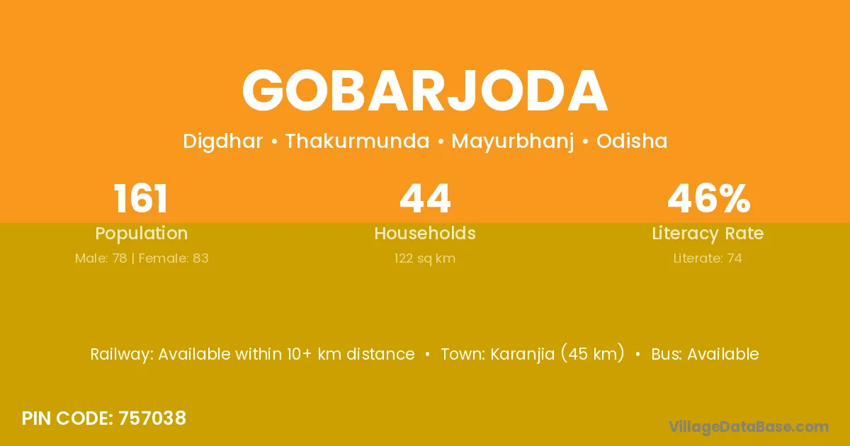 Karanjia (45 km) is the nearest town to Gobarjoda village for major economic activities and is located approximately 45 km away.