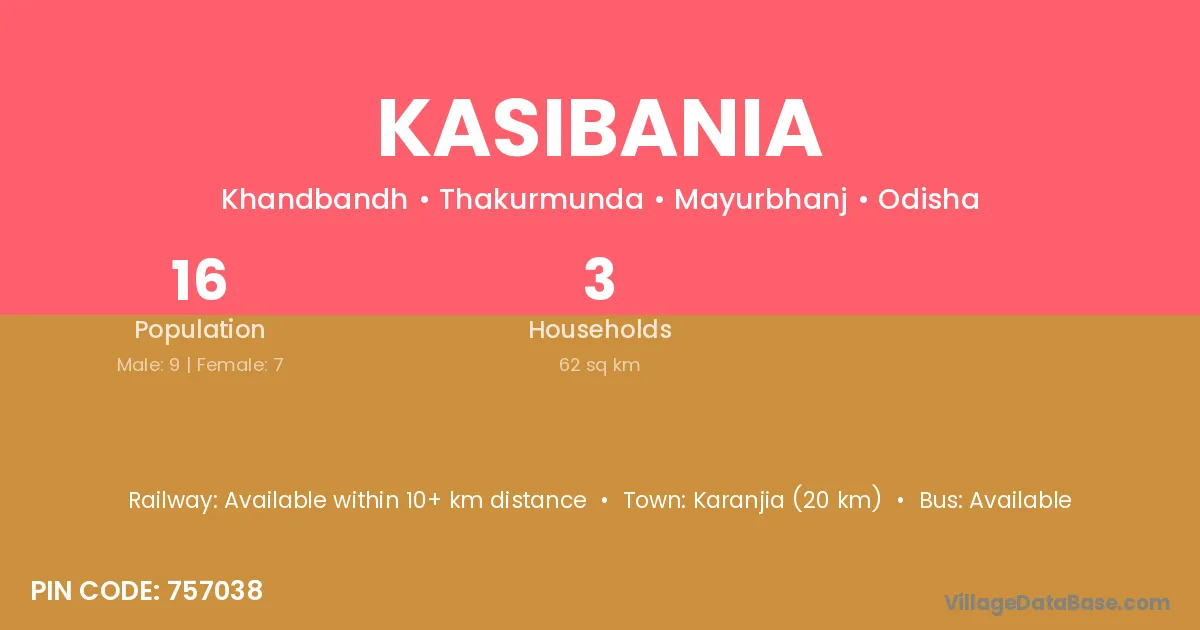 Karanjia (20 km) is the nearest town to Kasibania village for major economic activities and is located approximately 20 km away.