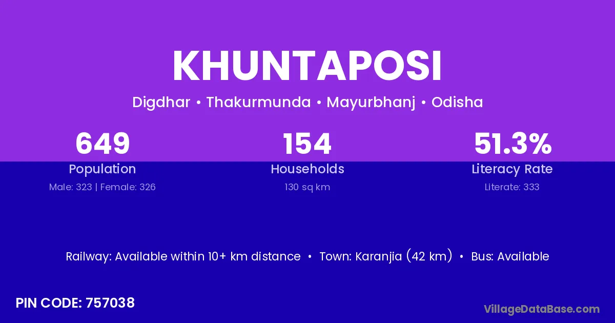 Karanjia (42 km) is the nearest town to Khuntaposi village for major economic activities and is located approximately 42 km away.