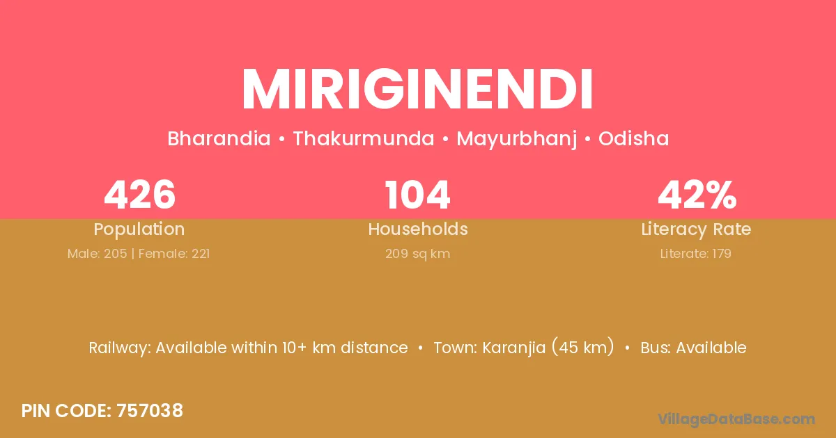 Karanjia (45 km) is the nearest town to Miriginendi village for major economic activities and is located approximately 45 km away.