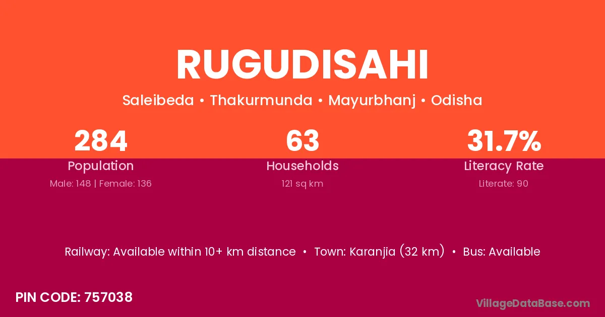 Karanjia (32 km) is the nearest town to Rugudisahi village for major economic activities and is located approximately 32 km away.