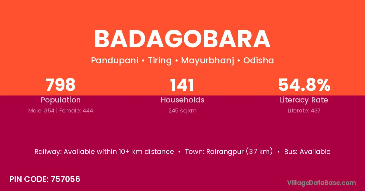 Rairangpur (37 km) is the nearest town to Badagobara village for major economic activities and is located approximately 37 km away.