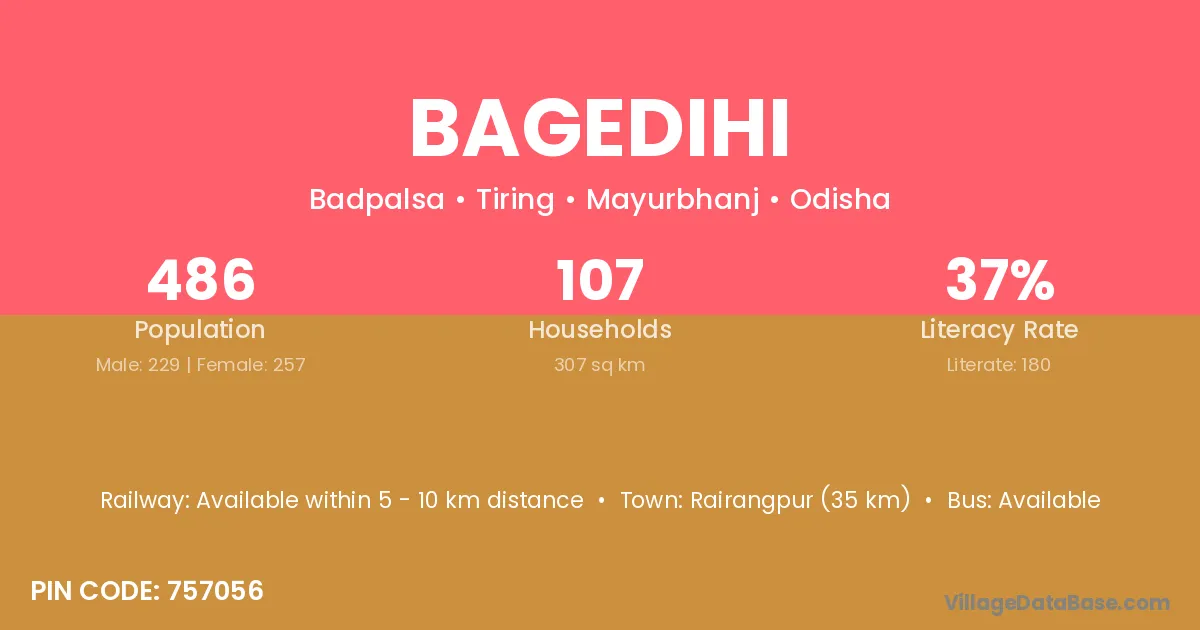 Rairangpur (35 km) is the nearest town to Bagedihi village for major economic activities and is located approximately 35 km away.