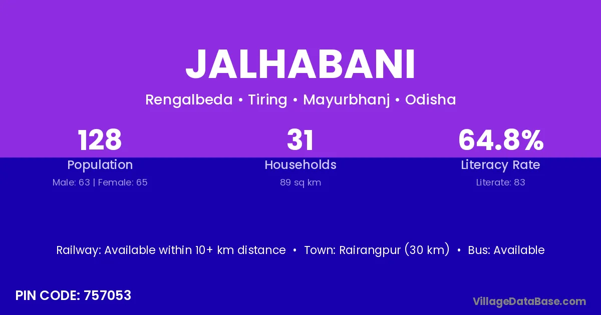 Jalhabani village has a total population of 128 people, of which 63 are males and 65 are females.