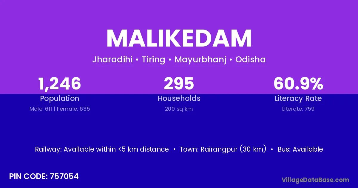Rairangpur (30 km) is the nearest town to Malikedam village for major economic activities and is located approximately 30 km away.