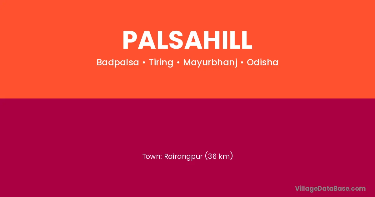 Rairangpur (36 km) is the nearest town to Palsahill village for major economic activities and is located approximately 36 km away.