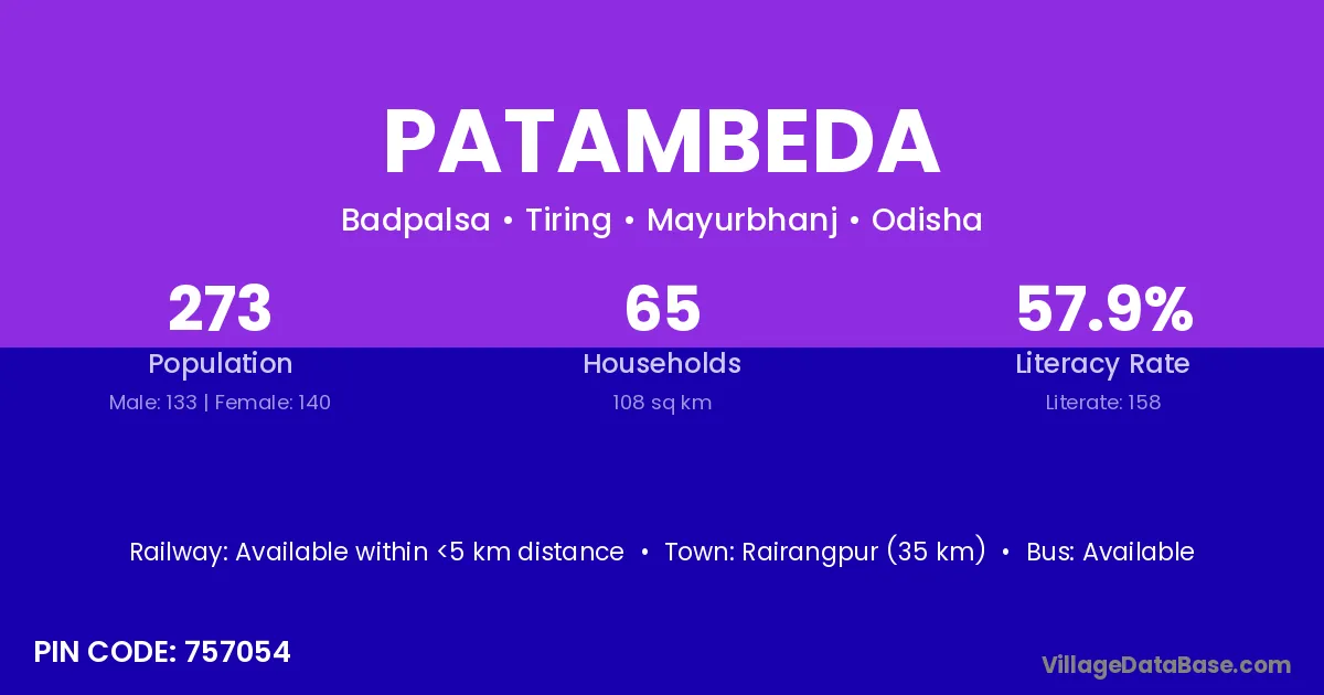 Rairangpur (35 km) is the nearest town to Patambeda village for major economic activities and is located approximately 35 km away.