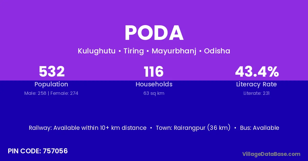 Rairangpur (36 km) is the nearest town to Poda village for major economic activities and is located approximately 36 km away.