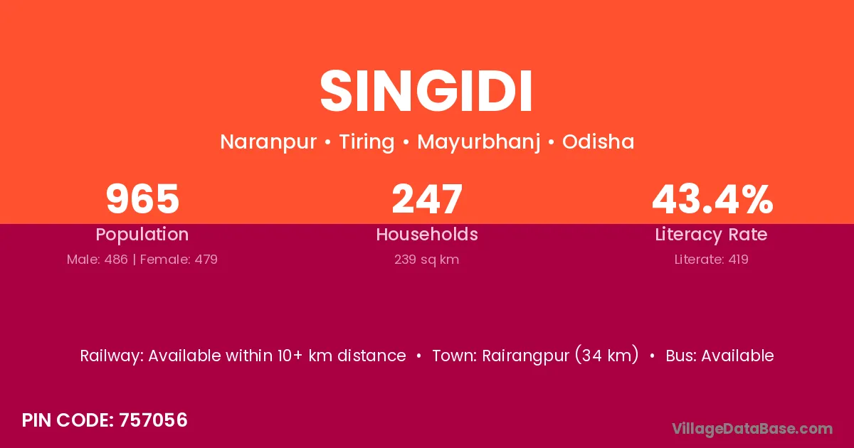 Rairangpur (34 km) is the nearest town to Singidi village for major economic activities and is located approximately 34 km away.