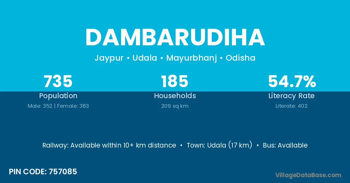 Udala (17 km) is the nearest town to Dambarudiha village for major economic activities and is located approximately 17 km away.