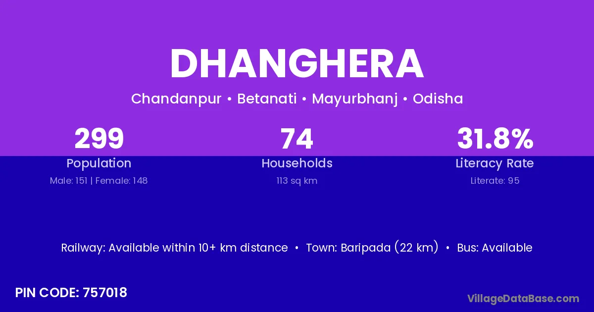 Dhanghera village has a total population of 1,374 people, of which 673 are males and 701 are females.