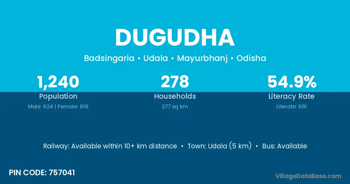 Dugudha village has a total population of 1,240 people, of which 624 are males and 616 are females.