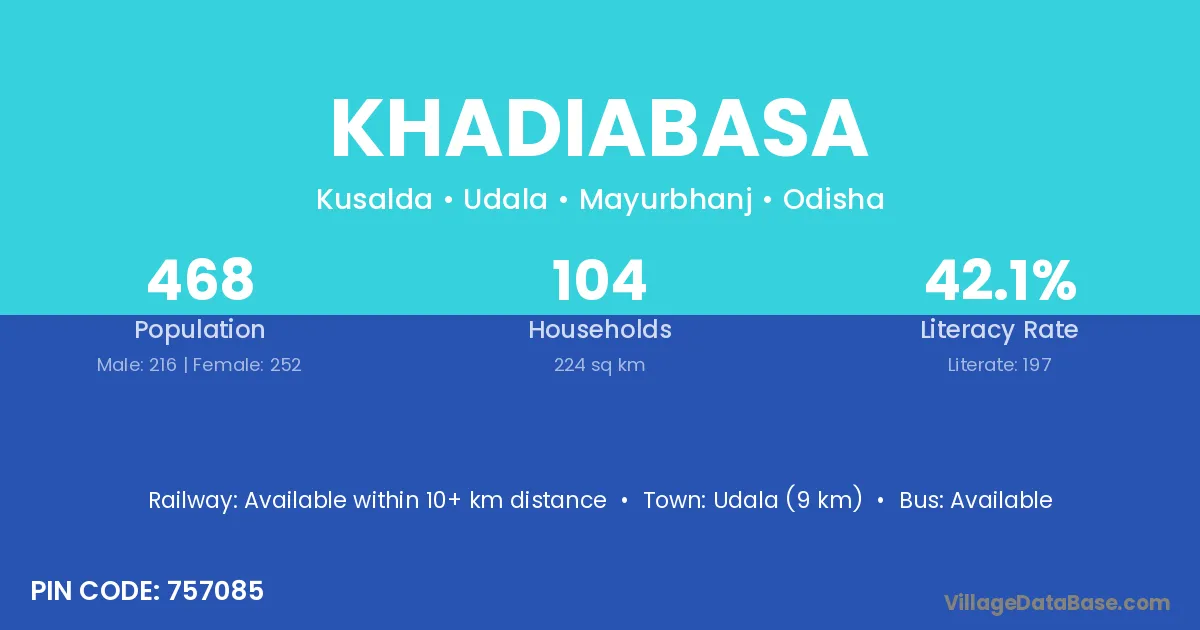 Khadiabasa village has a total population of 468 people, of which 216 are males and 252 are females.