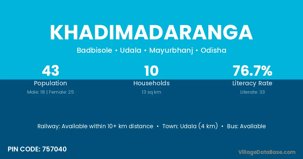 Udala (4 km) is the nearest town to Khadimadaranga village for major economic activities and is located approximately 4 km away.