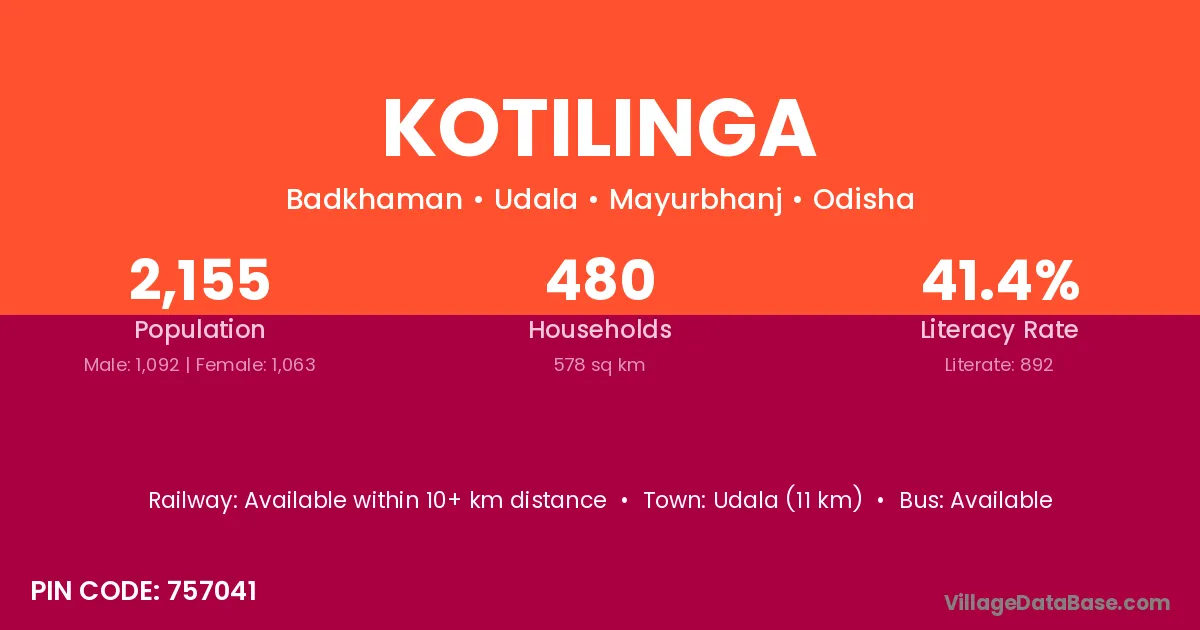 Kotilinga village has a total population of 2,155 people, of which 1,092 are males and 1,063 are females.