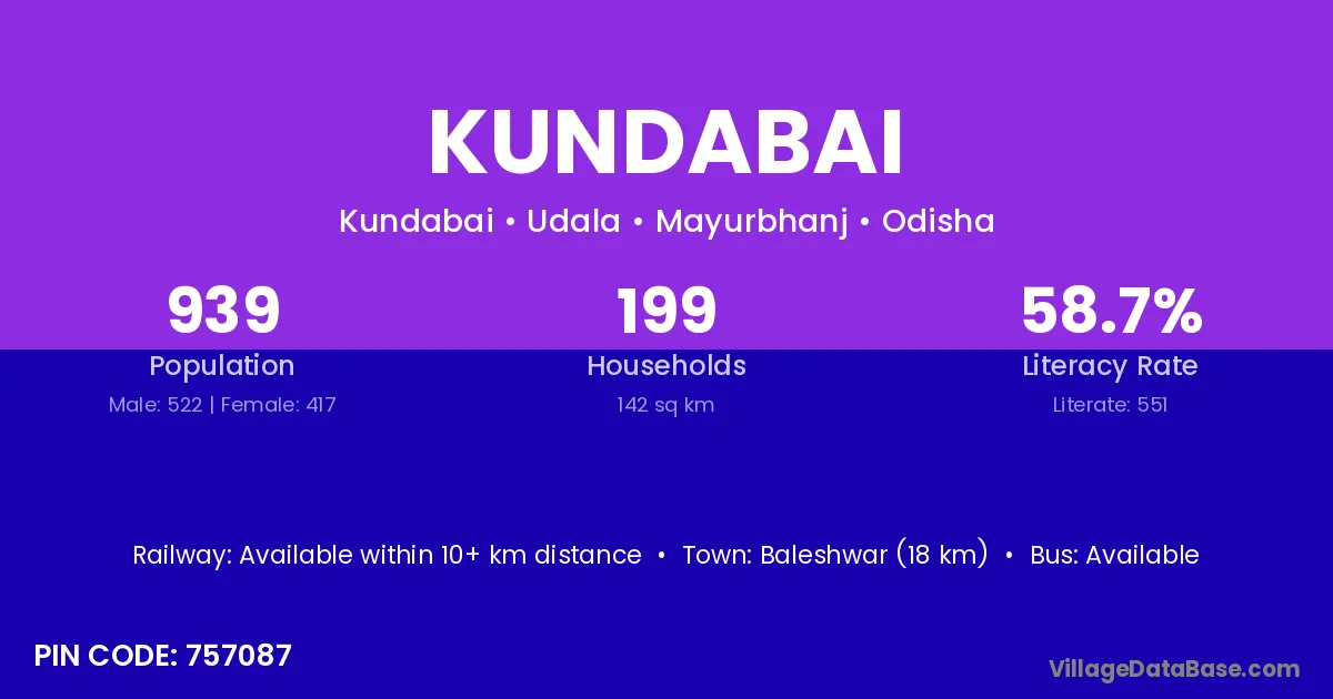 Baleshwar (18 km) is the nearest town to Kundabai village for major economic activities and is located approximately 18 km away.