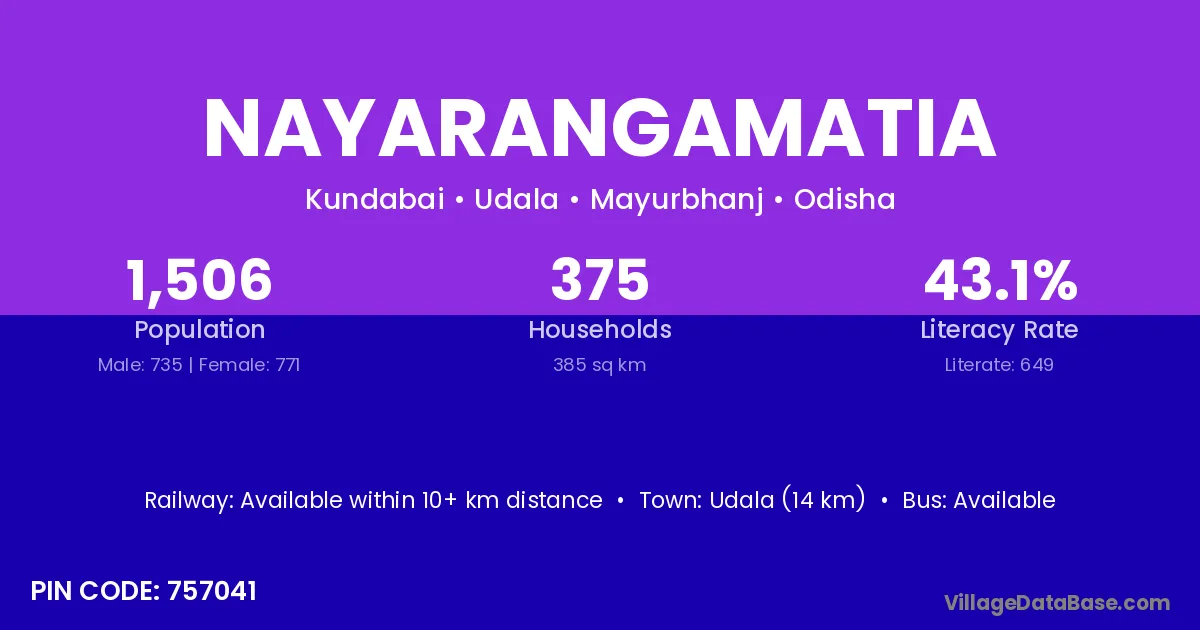 Nayarangamatia village has a total population of 1,506 people, of which 735 are males and 771 are females.