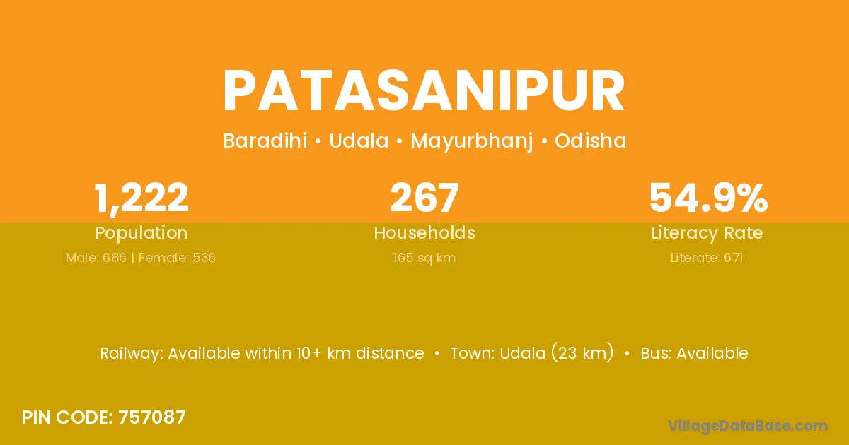 Udala (23 km) is the nearest town to Patasanipur village for major economic activities and is located approximately 23 km away.