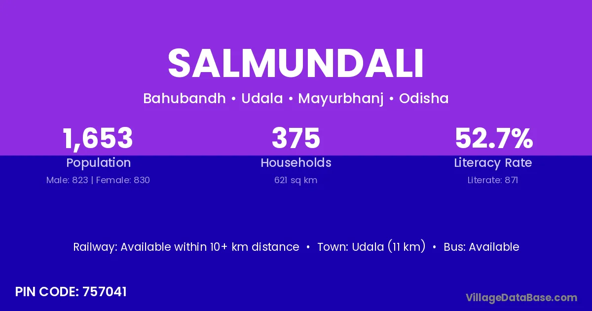 Udala (11 km) is the nearest town to Salmundali village for major economic activities and is located approximately 11 km away.