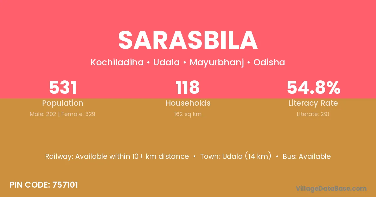 Udala (14 km) is the nearest town to Sarasbila village for major economic activities and is located approximately 14 km away.