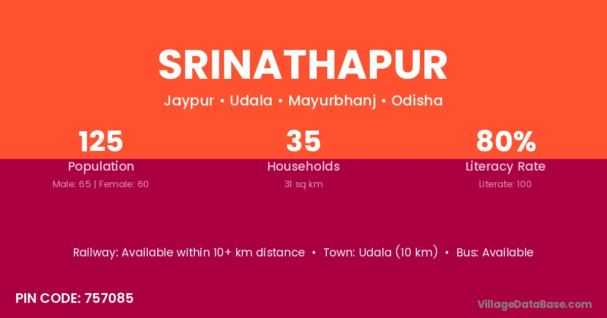 Udala (10 km) is the nearest town to Srinathapur village for major economic activities and is located approximately 10 km away.