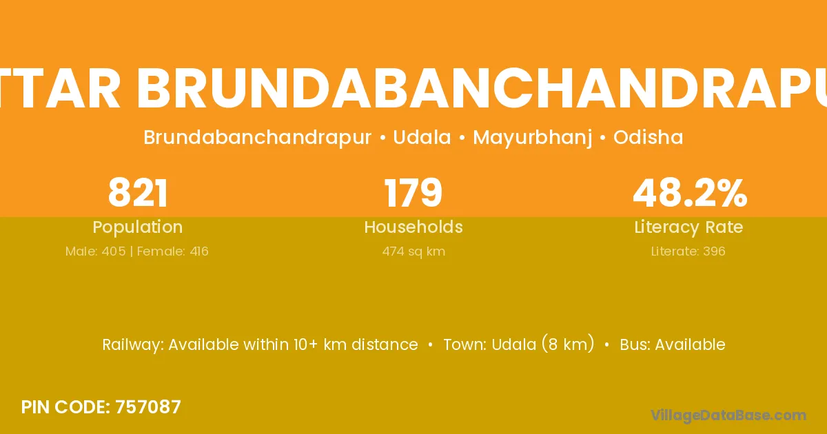Uttar Brundabanchandrapur village has a total population of 821 people, of which 405 are males and 416 are females.