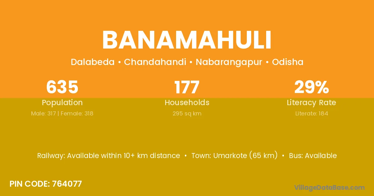 Umarkote (65 km) is the nearest town to Banamahuli village for major economic activities and is located approximately 65 km away.