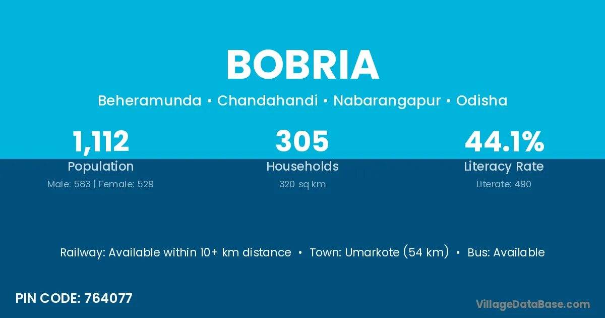 Umarkote (54 km) is the nearest town to Bobria village for major economic activities and is located approximately 54 km away.