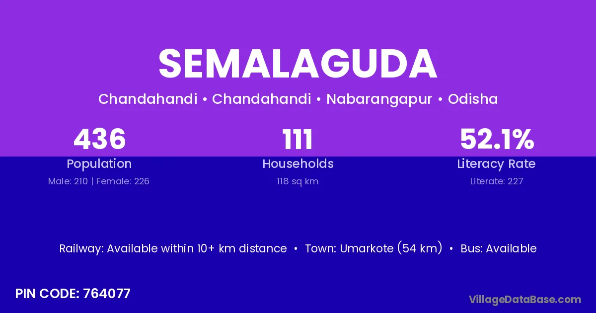 Umarkote (54 km) is the nearest town to Semalaguda village for major economic activities and is located approximately 54 km away.