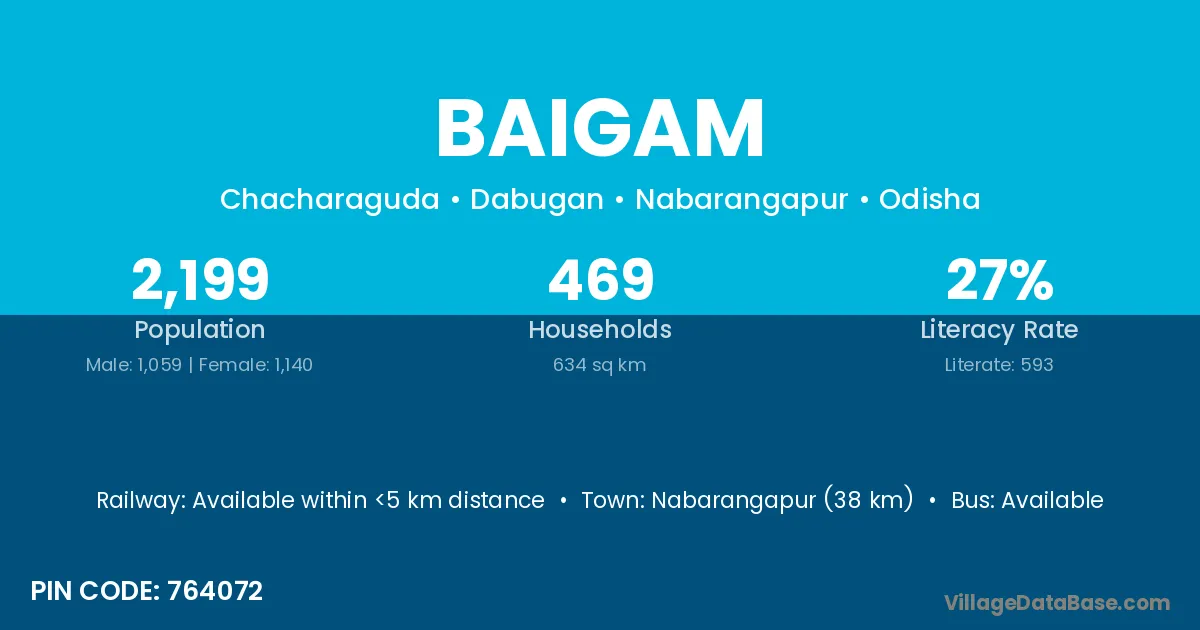 Nabarangapur (38 km) is the nearest town to Baigam village for major economic activities and is located approximately 38 km away.