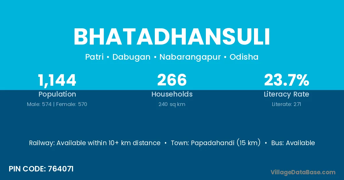 Papadahandi (15 km) is the nearest town to Bhatadhansuli village for major economic activities and is located approximately 15 km away.