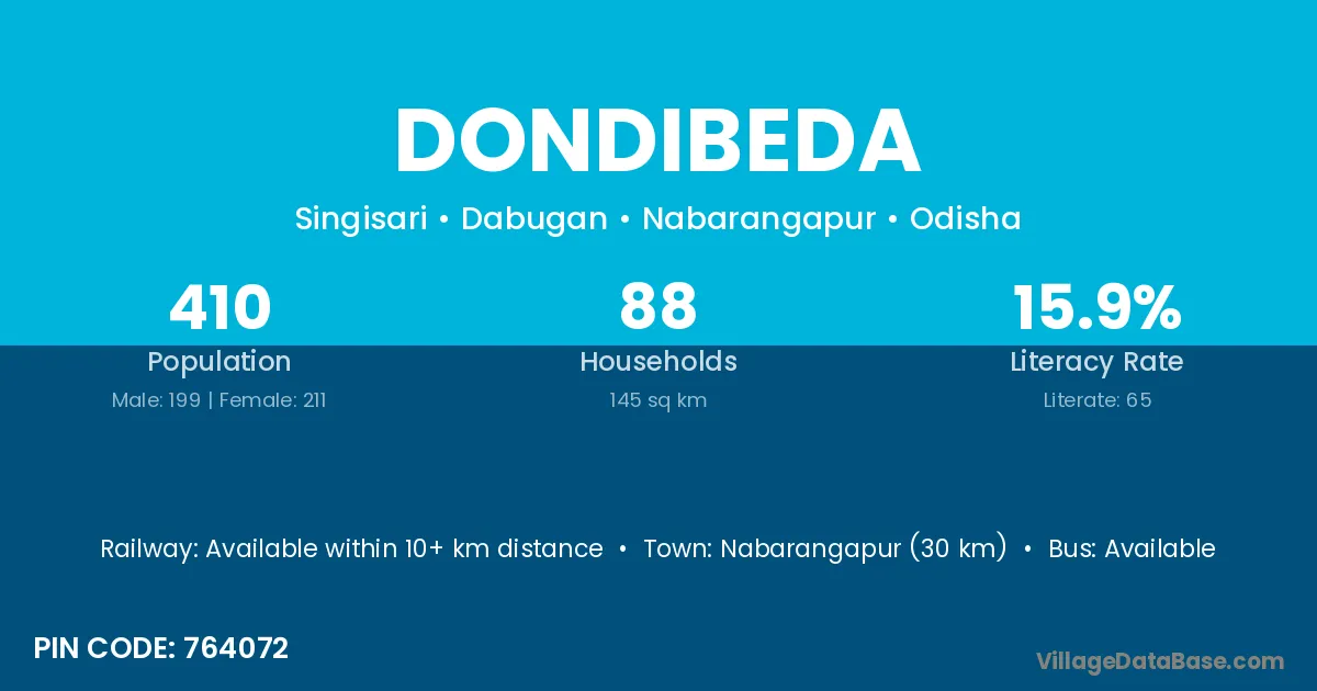 Nabarangapur (30 km) is the nearest town to Dondibeda village for major economic activities and is located approximately 30 km away.