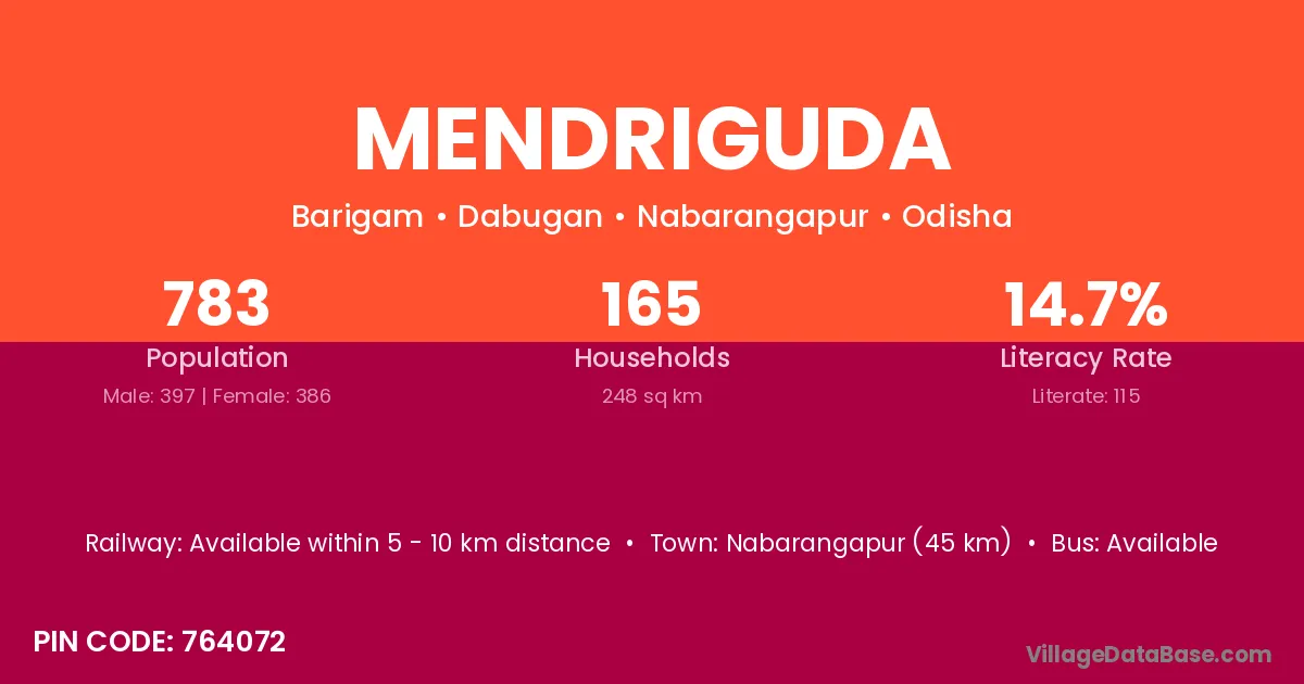 Nabarangapur (45 km) is the nearest town to Mendriguda village for major economic activities and is located approximately 45 km away.