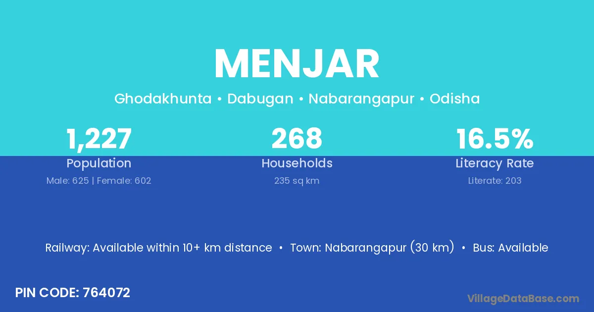 Nabarangapur (30 km) is the nearest town to Menjar village for major economic activities and is located approximately 30 km away.