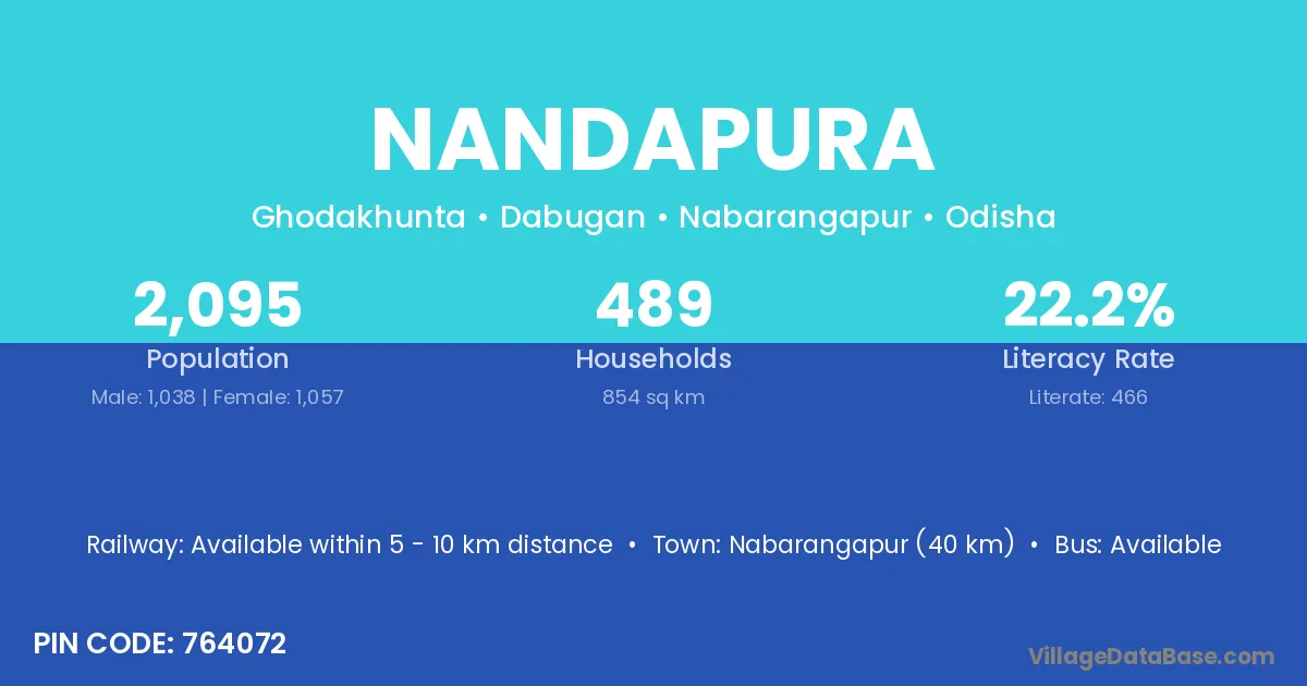 Nabarangapur (40 km) is the nearest town to Nandapura village for major economic activities and is located approximately 40 km away.
