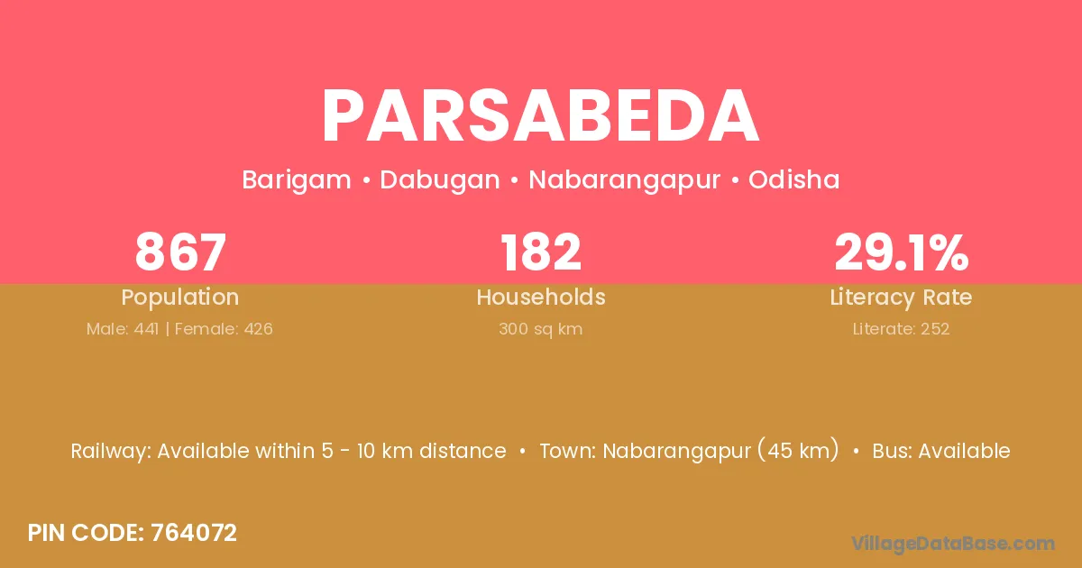 Nabarangapur (45 km) is the nearest town to Parsabeda village for major economic activities and is located approximately 45 km away.