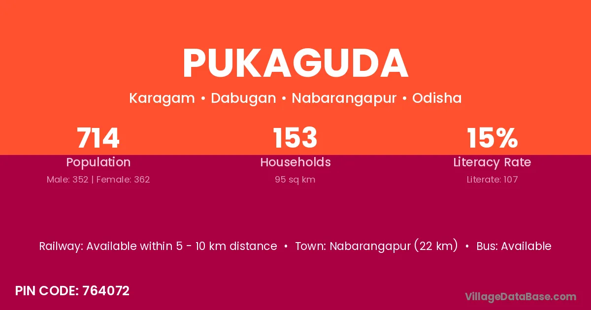 Nabarangapur (22 km) is the nearest town to Pukaguda village for major economic activities and is located approximately 22 km away.