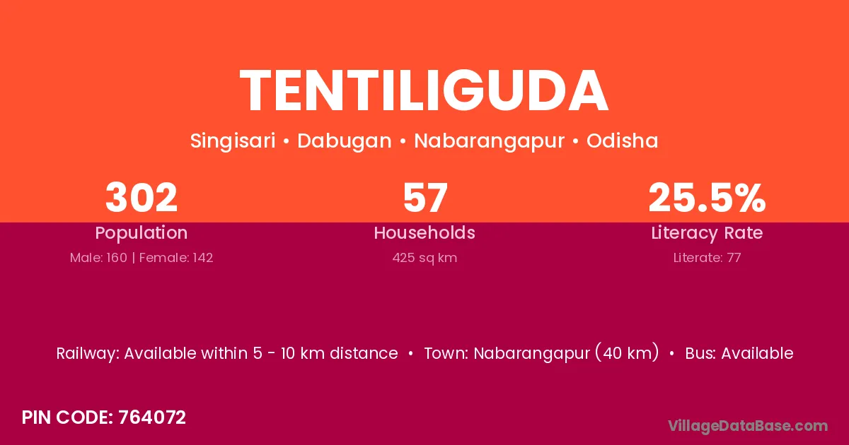 Nabarangapur (40 km) is the nearest town to Tentiliguda village for major economic activities and is located approximately 40 km away.