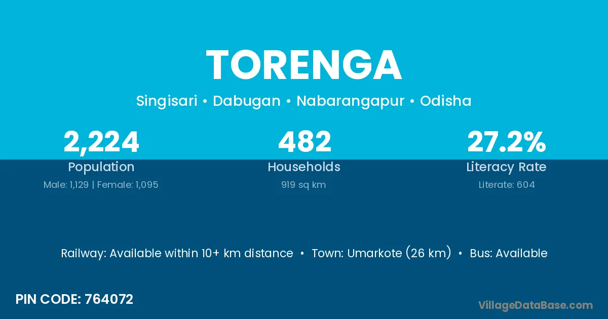 Umarkote (26 km) is the nearest town to Torenga village for major economic activities and is located approximately 26 km away.