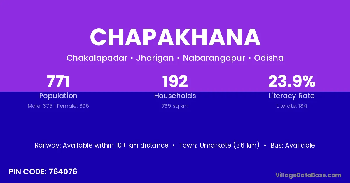 Chapakhana village has a total population of 771 people, of which 375 are males and 396 are females.