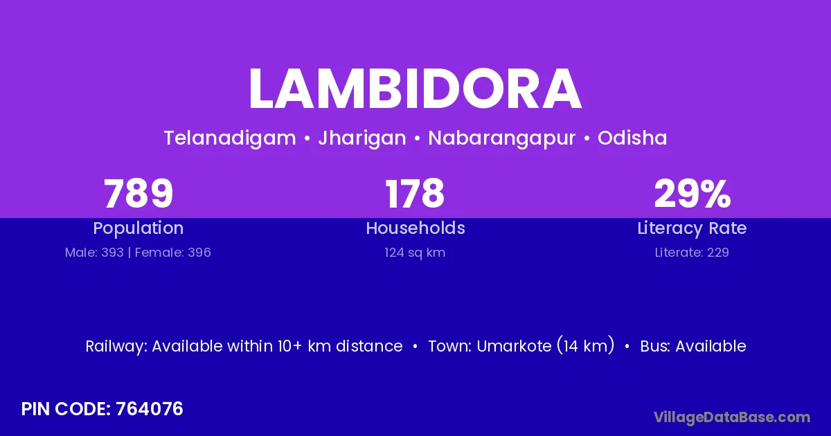 Umarkote (14 km) is the nearest town to Lambidora village for major economic activities and is located approximately 14 km away.
