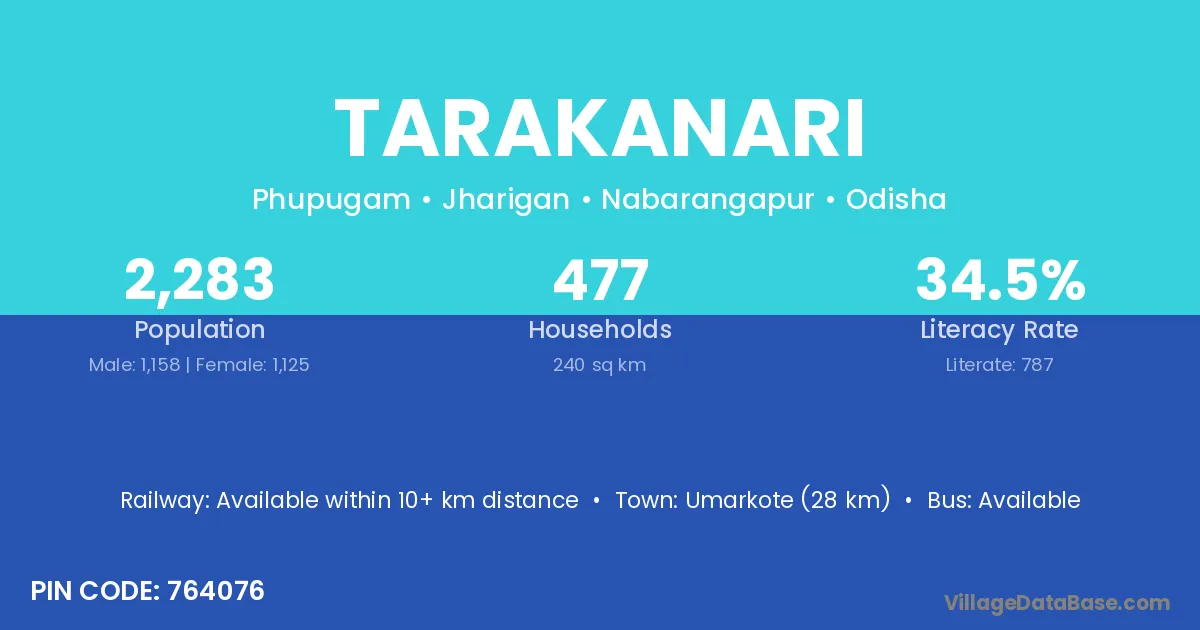 Umarkote (28 km) is the nearest town to Tarakanari village for major economic activities and is located approximately 28 km away.
