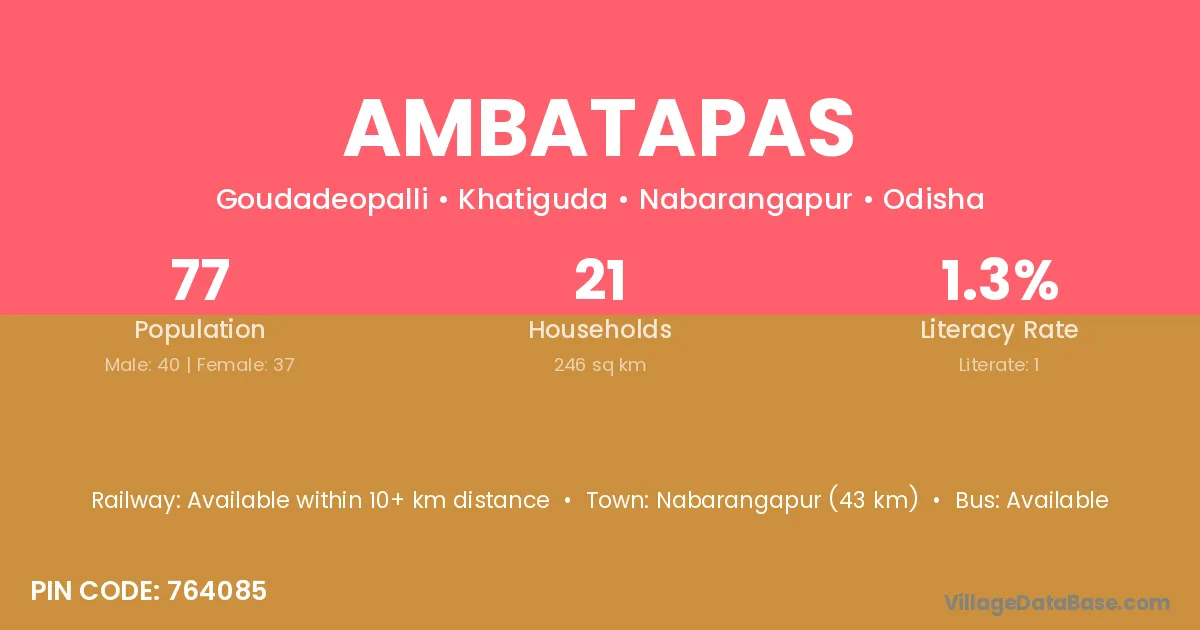 Nabarangapur (43 km) is the nearest town to Ambatapas village for major economic activities and is located approximately 43 km away.