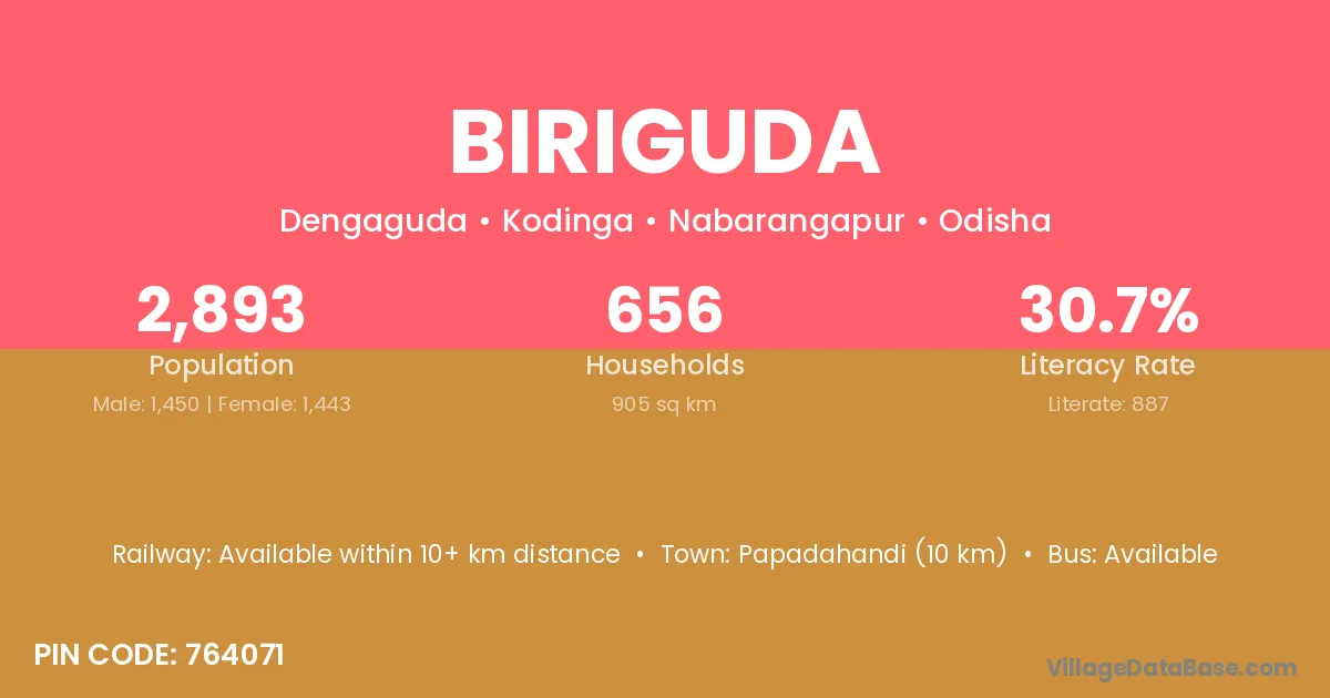 Nabarangapur (50 km) is the nearest town to Biriguda village for major economic activities and is located approximately 50 km away.