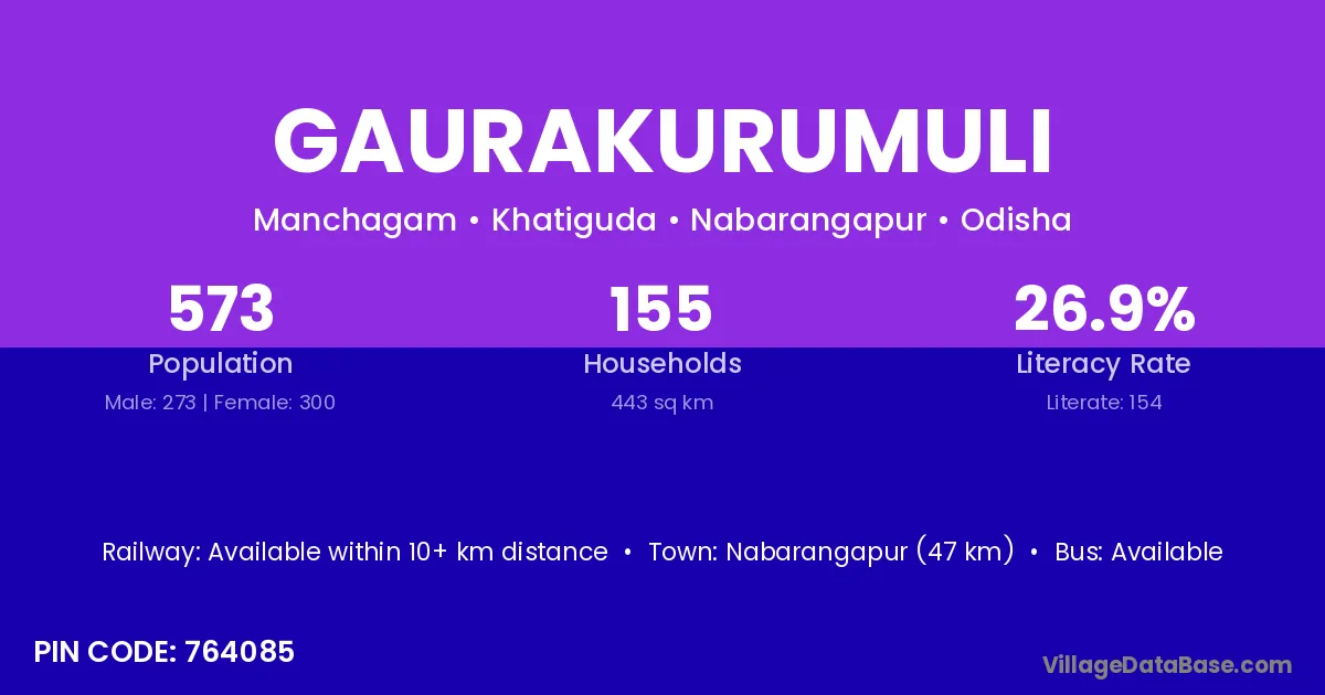 Nabarangapur (47 km) is the nearest town to Gaurakurumuli village for major economic activities and is located approximately 47 km away.