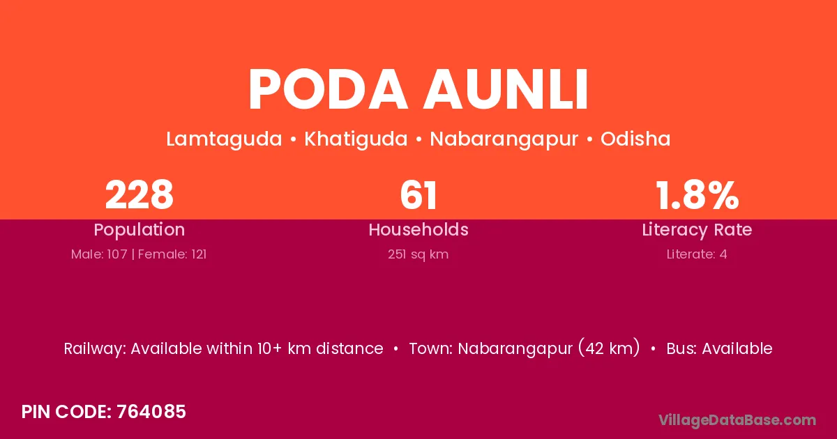 Nabarangapur (42 km) is the nearest town to Poda Aunli village for major economic activities and is located approximately 42 km away.